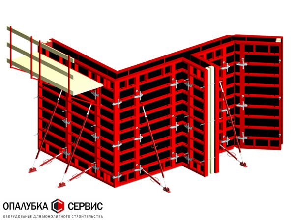Мы предлагаем крупнощитовую систему, которая состоит из щитов, которые включают в себя каркас и фанеру. Для бетонирования высоких конструкций не обойтись без вспомогательных элементов – они также есть у нас в наличии на складе.